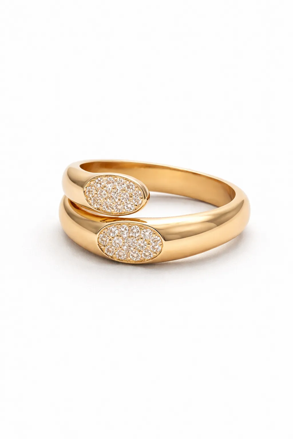 Son double anneau croisé et ses deux motifs ovales pavés de pierres créent un jeu de lumière subtil et élégant.